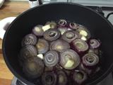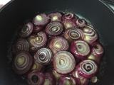 Pulite le cipolle e tagliatele a fette dello spesso di 1 cm. In una padella adatta anche per il forno, fate sciogliere 30 gr di burro, 2 cucchiai di zucchero di canna e l’aceto balsamico. Adagiate le cipolle ricoprendo tutta la superficie (foto 1). Unite il restante burro a fiocchetti e lo zucchero (foto 2).