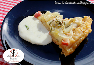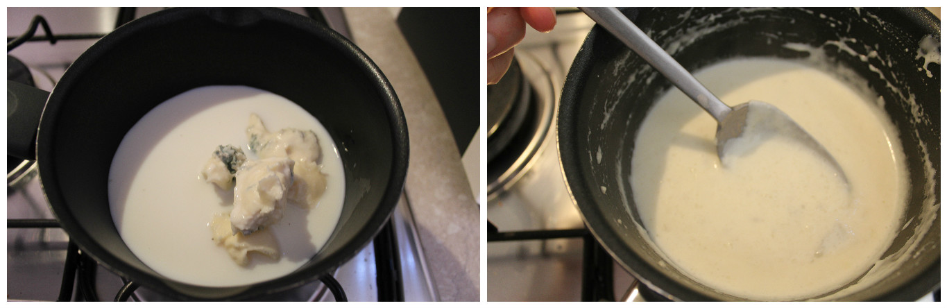 Mentre la torta cuoce preparate la salsa, mescolando il latte freddo con la maizena, aggiungetegli la gorgonzola e la noce di burro, mettete sul fuoco mescolando sempre finchè la salsa non velerà il cucchiaio.