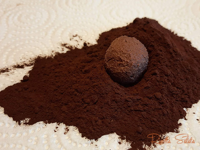 Tirare il composto fuori dal frigo e prelevare delle piccole porzioni . Con l’ aiuto di 2 cucchiai (oppure con le mani) formare delle palline e rotolarle nel cacao per realizzare la copertura.