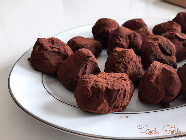 Disporre i tartufi ottenuti su un vassoio o piatto da portata e conservare in frigo fino al momento di servire.
