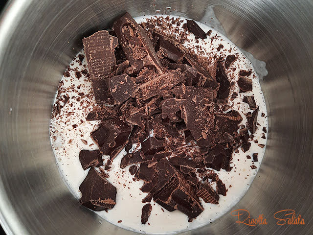 Tritare il cioccolato e aggiungerlo alla panna liquida in un pentolino.