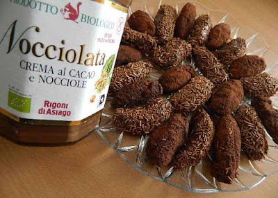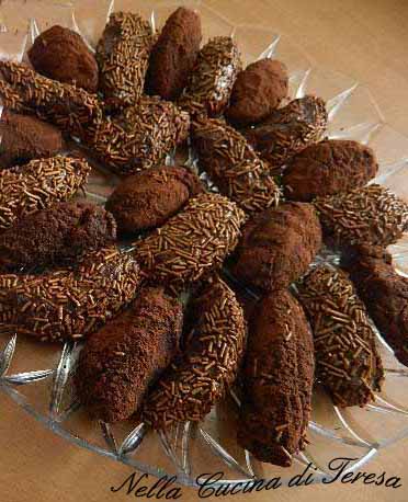 infine passare i tartufini nel cacao amaro o nelle codette di cioccolato o nella granella di nocciola, se preferite.