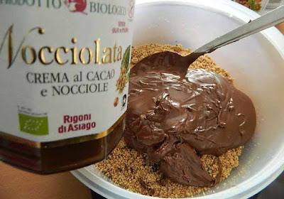 Riscaldare per 10 secondi in microonde o a bagnomaria la Nocciolata, questo servirà ad ammorbidirla ancora di più e renderà più agevole l’operazione di amalgamarla ai biscotti.