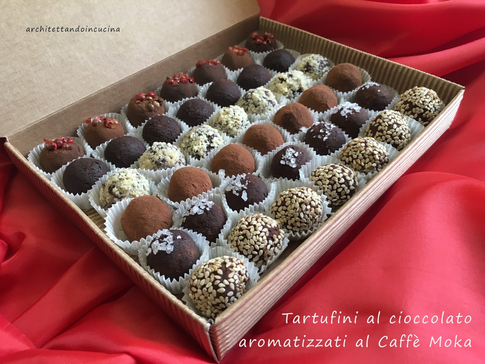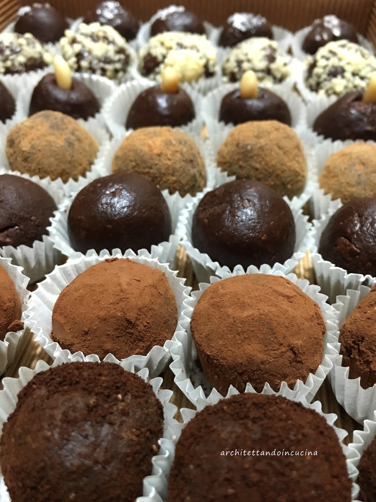 Dei tartufini rotolati nel cacao amaro, alcuni resteranno così, altri andranno completati con alcuni grani di pepe osa, altri con alcuni grani di sale di Cervia.