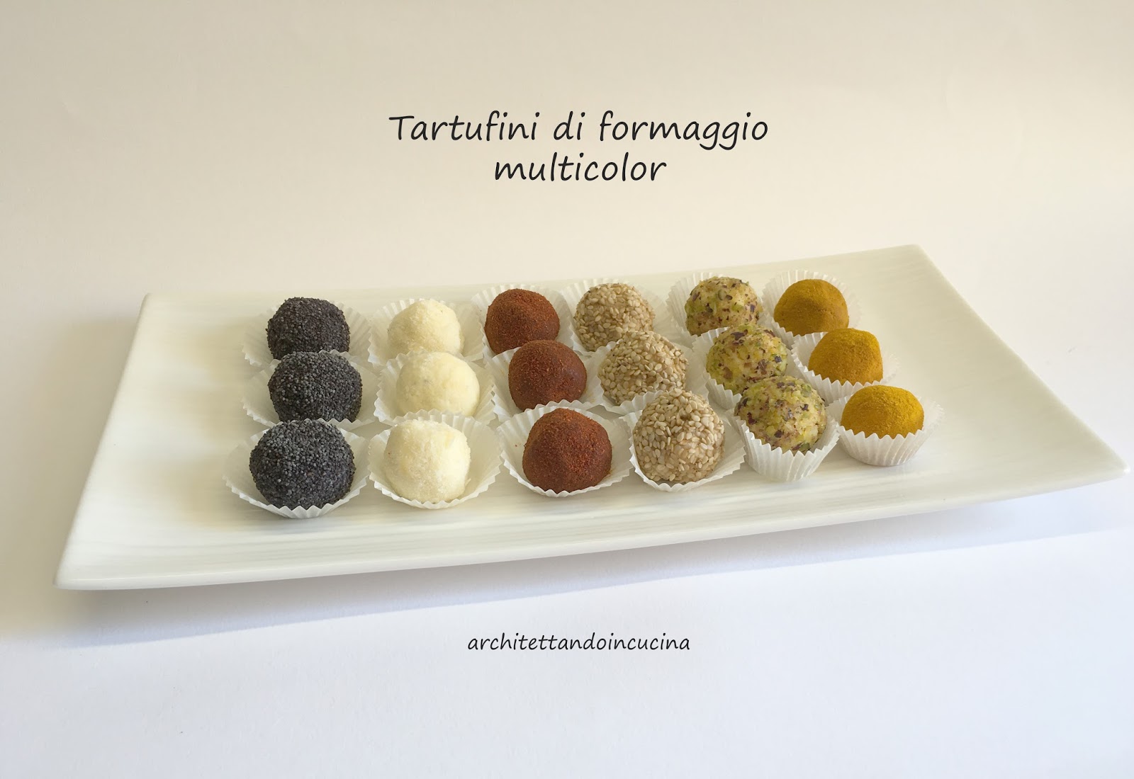 Trascorso il tempo di riposo, con l’aiuto di un cucchiaino, formare le palline. Poi preparare 6 ciotoline diverse con i diversi ingredienti di copertura e rotolarci le palline. Inserire ogni pallina in un pirottino di carta e tenere in frigo fino al momento di servire. Ottimo con le bollicine!