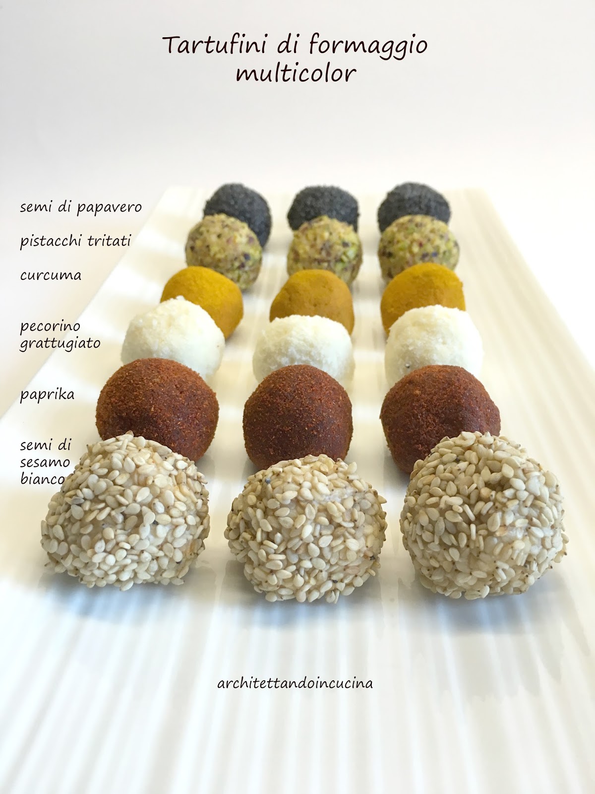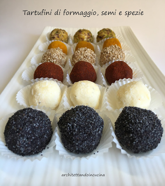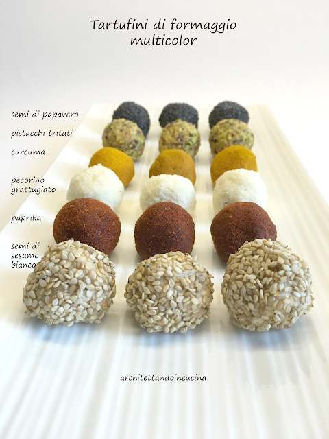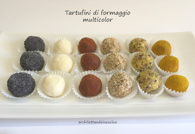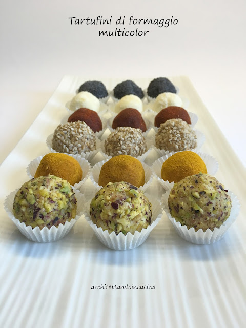 Questi tartufini, li faccio da anni e sono sempre un simpatico finger food per l’aperitivo sia da fare all’ultimo minuto, sia da preparare in anticipo. Ma sono anche un modo molto efficace per smaltire gli avanzi di vari formaggi che rischiano di invecchiare in frigorifero. Infatti fino a questo momento, non avevo mai scritto la ricetta, perché ogni volta la aggiusto in base alla disponibilità dei formaggi in frigo. Ma dato che questi li faccio spessissimo, in particolare per gli eventi, capita che le persone mi chiedano la ricetta e non è bello che sul blog non ci sia! Così oggi mi sono messa d’impegno, li ho fatti e fotografati.