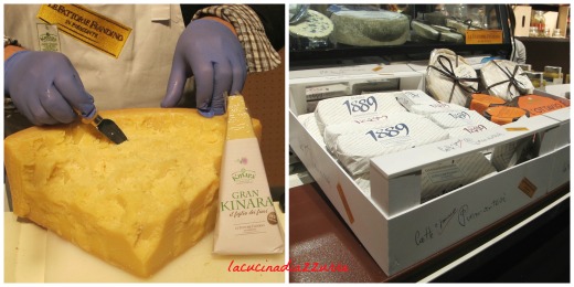 Ad un certo punto mi sento chiamare era Alessandra con lei siamo andate ad assaggiare il tanto decantato Gran Kinara (Le Fattorie Fiandino) l’unico formaggio al mondo a lunga stagionatura prodotto con caglio vegetale e non animale. L’altro loro prodotto che mi ha conquistata è stato il burro, sia neutro che salato, un burro spalmabile reso così pregiato per la bontà della materia prima e le fasi di lavorazioni controllate con la massima cura. Le panne ottenute per centrifuga dal loro prezioso latte piemontese vengono lasciate riposare ben 72 ore prima di diventare burro. Non potevo non assaggiare quel capolavoro che ogni anno fotografo dell’azienda “La Casearia” il formaggio erborinato ricoperto da mirtilli rossi essiccati dal nome “Ubriaco d’amore”,la dice lunga….Questo formaggio vaccino a latte crudo con evidenti infiltrazioni di vino, affinato in vino e vinaccia di Amarone della Valpicella DOC ha un sapore particolarmente intenso e avvolgente, decisamente divino!