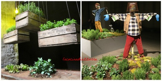 Nella prima foto un assaggio degli allestimenti, molte delle zone sono state addobbate con pezzi meravigliosi di Riccardo Barthel, come questo vecchio lavabo, arricchito dal verde delle piante aromatiche; sparse ovunque queste cassette in legno che ricordano le vecchie cassette dove venivano messe le mele dopo la raccolta addobbate con piantine varie, spaventapasseri a rappresentare la natura dei “campi” all’interno del Taste!