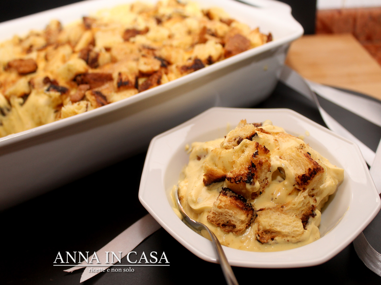 Formare ancora uno strato di dadoni di pane, 1/2 della dose rimasta e coprire con il resto della crema.
