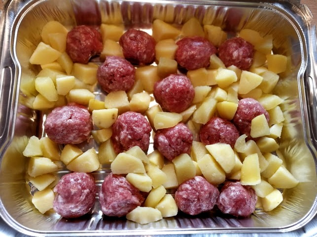 Ora porre sul fondo della teglia usa e getta la salciccia che deve essere ridotta a palline di media grandezza.