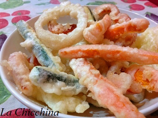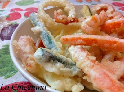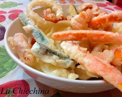 Eccomi. Oggi vi voglio lasciare la ricetta della tempura di verdure. Quella che vi propongo è particolare: senza uova e con farina di riso, quindi glutenfree; è una preparazione semplice, bisogna solamente essere molto veloci nella frittura dei pezzetti di verdura e usare acqua minerale ghiacciata in modo da creare lo shock termico che permette di ottenere una frittura asciutta e molto croccante.