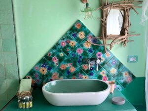 La Tenuta Le Tre Virtù è tutto questo e anche molto di più e lo scoprirete continuando a leggere. Tutto inizia nel 2010 quando la coppia s’innamora di questa tenuta, immersa nel Parco Nazionale del Mugello, un territorio poco conosciuto della Toscana rispetto ad altri, ma con un suo particolare fascino: un borgo abbandonato, risalente alla fine del Settecento, già presente nelle mappe della famiglia Medici, e dopo un grande lavoro di ristrutturazione, mantenendo però le caratteristiche originali e storiche, la trasformano nel 2016 in un relais con 7 lussuose suite, una diversa dall’altra, ciascuna con la sua personalità, caratterizzate da colori e arredi differenti curati personalmente da Valentina. Niente è lasciato al caso e tutto, dai mobili agli accessori, è frutto di una ricerca nei mercatini di bric à brac, di studi di spazi, di pezzi unici realizzati da abili artigiani del luogo: dalle lampade ai tavoli assemblati con legni di recupero. I nomi delle suite evocano sogni: Alba Chiara, Luce del Cielo, Profumo di Lavanda, Essenza di Limone, Verde Natura, Romantica e Magnifica. piscina - photo credit @isabellaradaelli