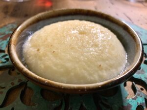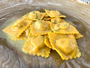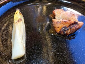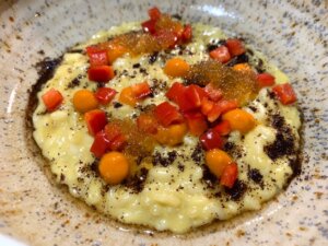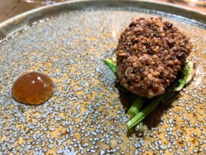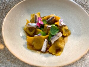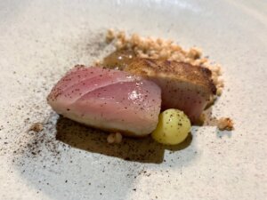Il menu si apre con animella cotta alla brace, con invidia e gin tonic, che gli conferisce una certa freschezza. A seguire la ricciola dell’Elba in due consistenze, proposta cotta e cruda, con cicale e salsa di rafano. Accompagnato da Otto Muri dell’azienda Collazzi, Fiano in purezza e Terre di Giotto di Gattaja, 80% Sauvignon Blanc e 20% Sauvignon Gris.