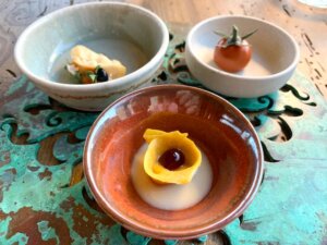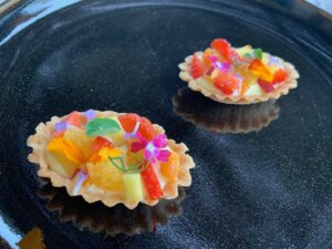 Prima di partire con quello di 7 corse, si inizia con gli “stuzzichi”: barchetta ripiena di cipolla dorata e gel di vin brûlé e fonduta di Parmigiano 24 mesi; tacos di mais farcito con gambero biondo di Viareggio, maionese al nero di seppia e gel di lische di gambero; finto pomodoro di paté d’anatra ricoperto da una pellicola di pomodoro. E spuma di patate aromatizzate alla vaniglia con tartufo, mousse di cioccolato bianco, tartufo e buccia di patate. Accompagnati da una bollicina toscana Fèlsina Brut Rosé Metodo Classico, 50% Sangiovese, 30% Pinot Nero e 20% Chardonnay. Un percorso di abbinamento vini che sarà tutto made in Tuscany.
