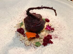 Un piatto di “mezzo”: la rapa rossa cotta a bassa temperatura ripiena di caprino, cappuccio di rapa fritta, polpa di rapa in tartare e biscotto salato al pepe nero, dove la rapa sembra quasi laccata alla vista, mentre al gusto si percepiscono le tre diverse cotture. Abbinato a Burrone Chianti Classico 2012. A seguire il piccione di Firenzuola servito su un letto di spinaci e gel di Vin Santo, cotto al punto giusto e che in bocca sprigiona sapori decisi, accompagnato a Sileno Ciliegiolo in purezza IGT 2016 dell’azienda Sator.