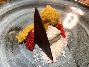 I dolci: un arioso pre-dessert una spuma di mele con croccante di noci anticipa una créme brûlée di pistacchio e lampone, servita con Vermouth del Mugello.