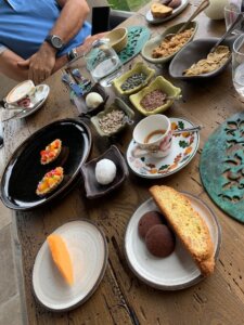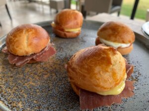 La mattina prima colazione stellata, e come poteva essere diversamente?!? In linea con la stella Michelin che brilla sopra la tenuta: yogurt al malto, latte fresco pastorizzato al momento, tartellette di frutta fresca, panini con bresaola e fontina, e con salmone e caprino, uova sode raccolte la mattina nel pollaio, cantucci e biscotti al cioccolato e dulcis in fundo, per rimanere in tema, delle mini brioschine farcite al momento, a scelta con cioccolato, confettura di uva fragola o crema inglese, direttamente dallo chef.