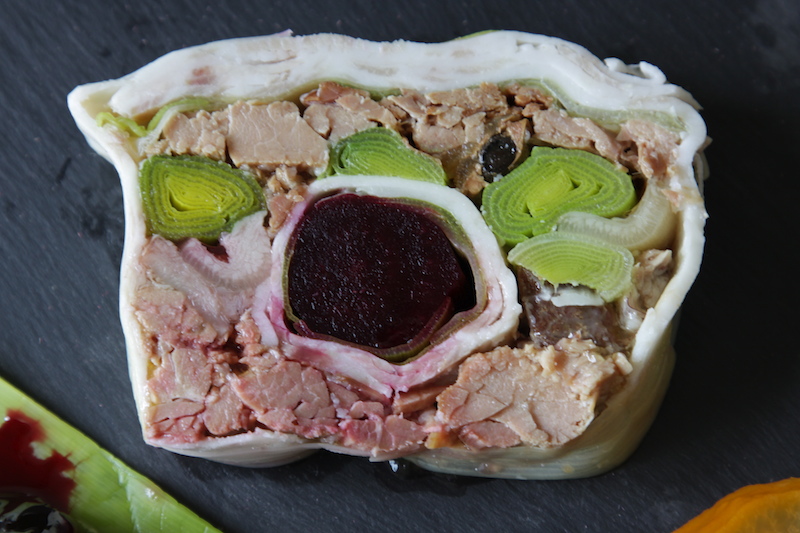 Per la gelatina. Ricoprite la testa del maiale con dell’acqua fredda. Unite le spezie, portate a bollore e fate cuocere a fuoco basso per 4 ore. Schiumate quando necessario. Al momento di utilizzare il brodo filtratelo, riportatelo sul fuoco, unite del ghiaccio (meccanismo che lo renderà limpido) prelevatene la dose che vi servirà e mettetelo da parte fino alla composizione della terrina. Tenete da parte la testa.