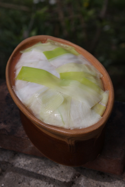 Per la composizione della terrina. Fate sbollentare in acqua bollente salata tre porri lasciati interi. Non devono disfarsi. Una volta pronti trasferiteli in un contenitore con acqua e ghiaccio in modo tale che mantengano il colore brillante.