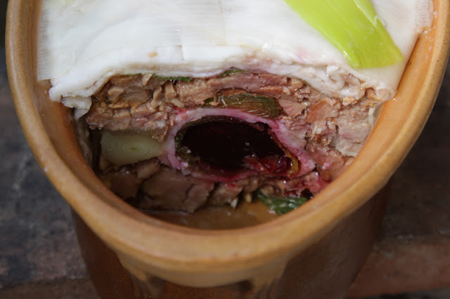 Rivestite la terrina con le foglie di porro e le fette di guanciale. Ponete sulla base la carne e il musetto alternati, assieme ai porri lasciati interi. Ottenete un cilindro dalla rapa, avvolgetelo nelle foglie di porro e poi nelle fette di guanciale, per tamponare i succhi rossi. Riempite la terrina, versatevi il brodo, richiudete con le fette di guanciale e le foglie di porro.
