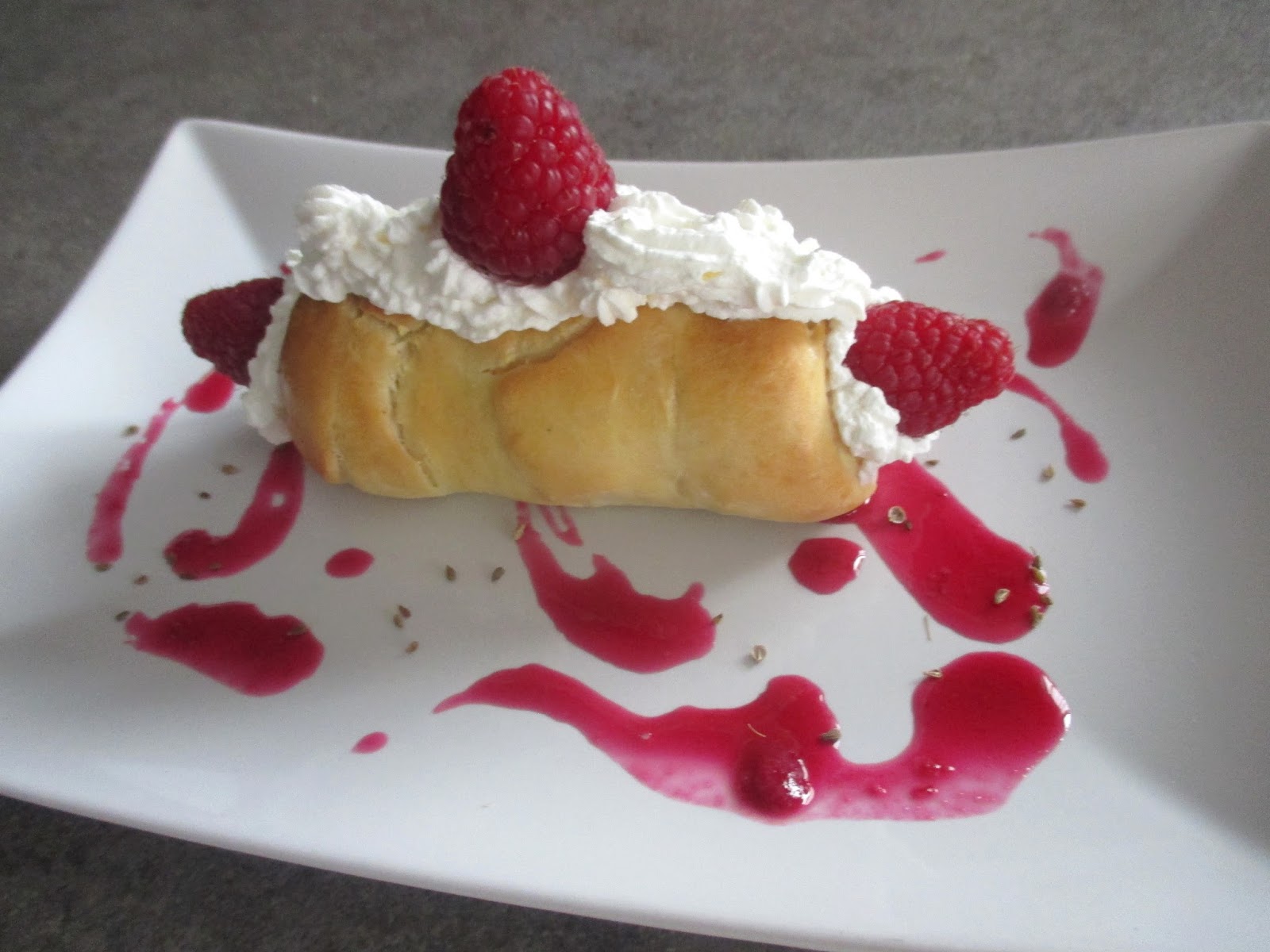 finement haché framboises et mélanger avec la crème. Avec un sac à pâtisserie cannoli rempli et toujours servi avec coulis de framboises ou cerises.