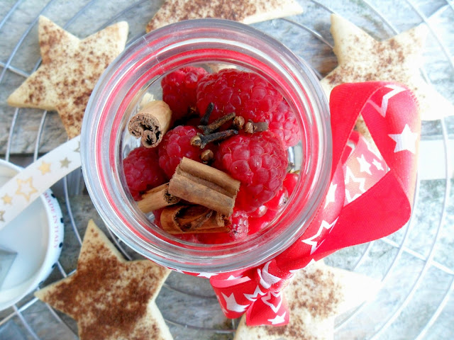 Per regalare il Christmas Punch occorre avere un vasetto sterilizzato, dove poter aggiungere all’ultimo momento- poche ore prima che si doni- 125 g di frutti rossi (io ho utilizzato lamponi e ribes) con cannella e chiodi di garofano a piacere. Aggiungiamo un bel fiocco e un biglietto che reciti tutte le istruzioni.