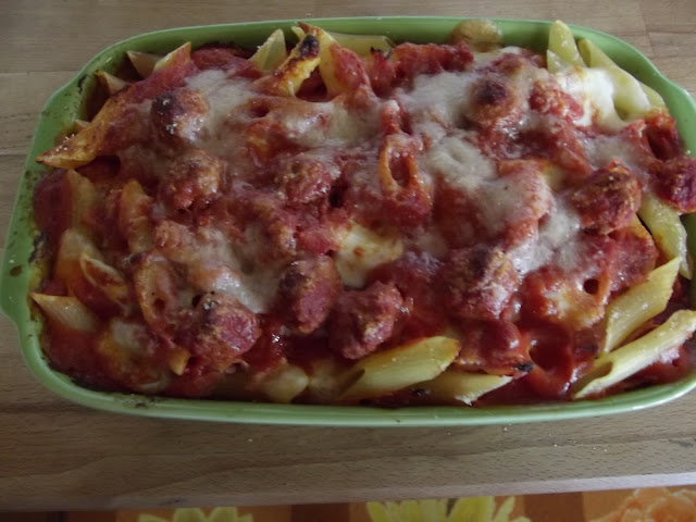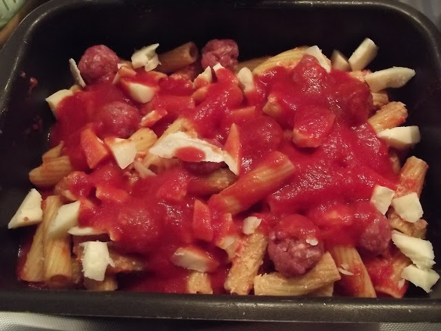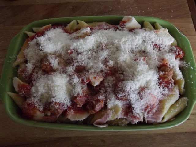 Fate uno strato di sugo con polpettine nella pirofila da forno, uno strato di pasta, polpettine, mozzarella a dadini e prosciutto spezzettato, quindi un altro strato di pasta e cosi’ via per concludere con una bella spolverata di parmigiano.