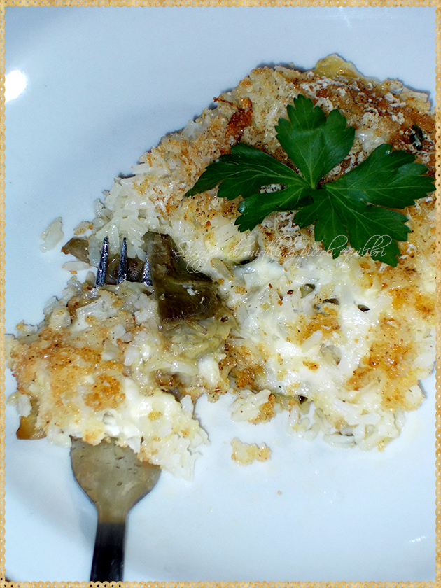Riso, carciofi, mozzarella e Grano Padano, il tutto cotto in forno il tempo di formare una leggera crosticina croccante. Delizioso.