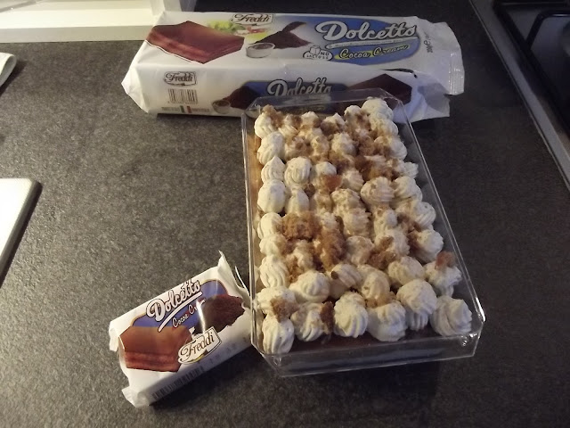 Disponete nel contenitore uno strato di panna montata al caffe, quindi bagnate le merendine Freddi con del caffe’ e fate uno strato sopra la panna. Alla fine decorate con dei ciuffetti di panna e una merendina sbriciolata.