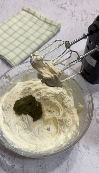 Versa in una ciotola il mascarpone freddo insieme alla panna liquida per dolci, anch’essa fredda. Inizia a montare con le fruste elettriche fino a ottenere un composto gonfio. A questo punto, aggiungi la crema spalmabile al pistacchio e continua a montare ancora per un paio di minuti, giusto il tempo necessario per amalgamare perfettamente gli ingredienti. Il risultato finale dovrà essere una crema sostenuta, liscia e vellutata. Per la ricetta passo passo della crema al pistacchio guarda qui: