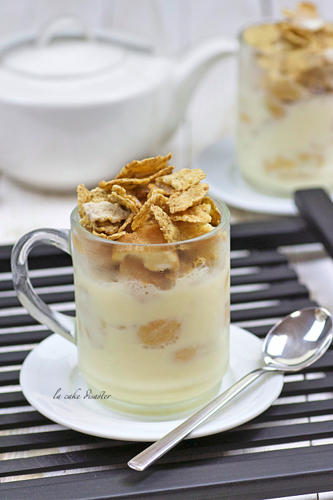 Prepariamo il tè nero aromatizzato arancia e cannella, lo mettiamo da parte lasciandolo raffreddare. Nel frattempo in una ciotolina, mescolare bene lo yogurt ed il latte condensato e poi farlo riposare per 20 minuti nel frigo. A questo punto iniziamo a preparare il tiramisù. Io ho usato delle tazze da tè, in modo da preparare già le porzioni. Uno strato di composto di latte condensato e yogurt, poi savoiardi inzuppati nel tè nero aromatizzato, cereali e di nuovo il composto di latte condensato e yogurt, ripetere fino a riempire le tazze. Mettere poi il tutto nel frigo per almeno 3/4 ore. Servire freddo.
