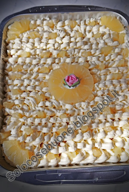 Terminate con la crema di mascarpone distribuita in modo da formare piccoli riccioli di crema. Distribuite ancora pezzettini di ananas e decorate gli angoli della teglia con un quarto di fetta di ananas. Al centro disponete invece una fetta intera.