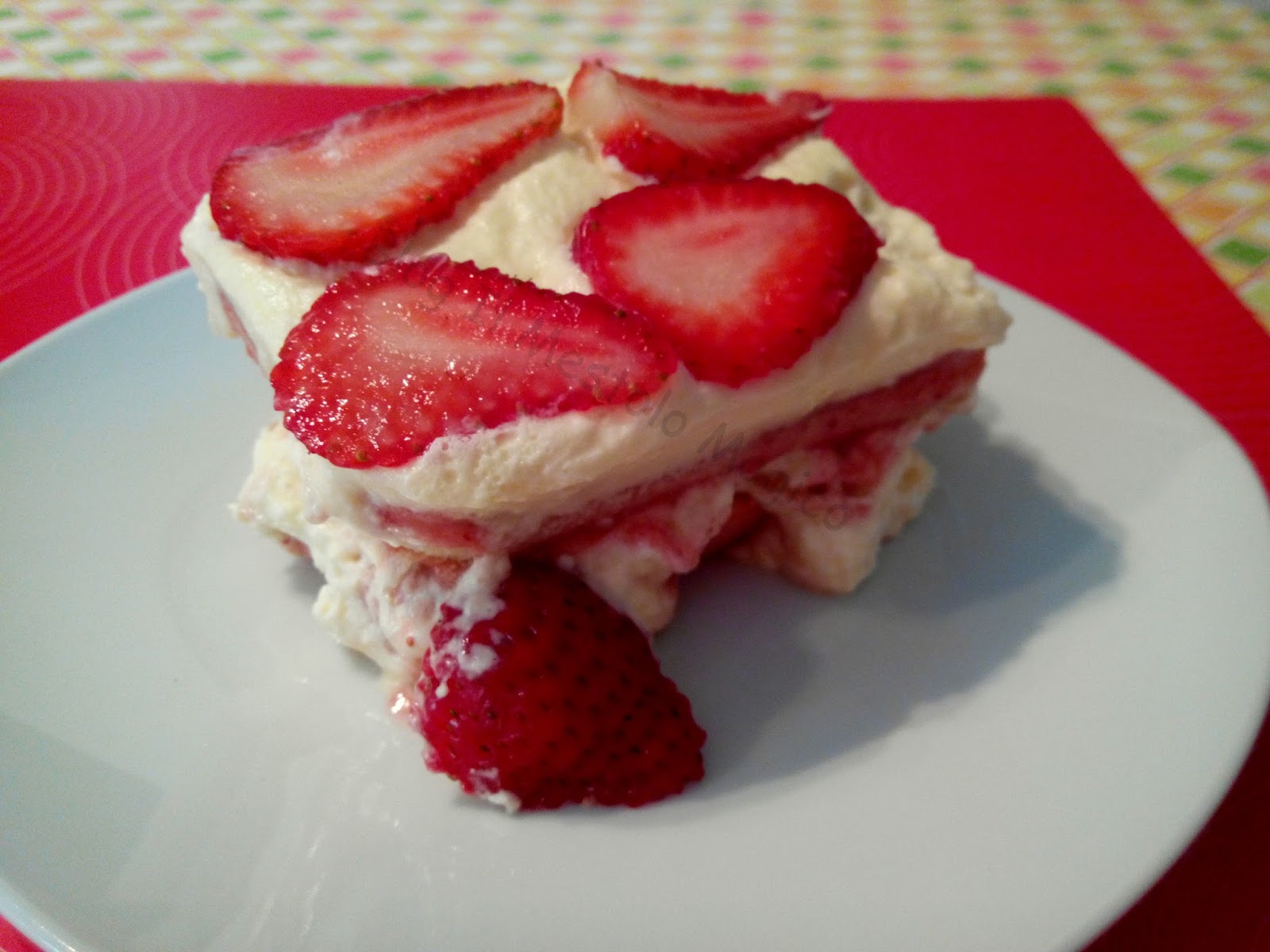 Inzuppiamo i biscotti nel succo alla fragola e disponiamoli nella pirofila. Porseguiamo a strati: uno di crema, uno di fragole tagliate a fettine sottili, uno di biscotti inzuppati e ripetiamo con la crema. Fino a terminare con le fragole in superficie.