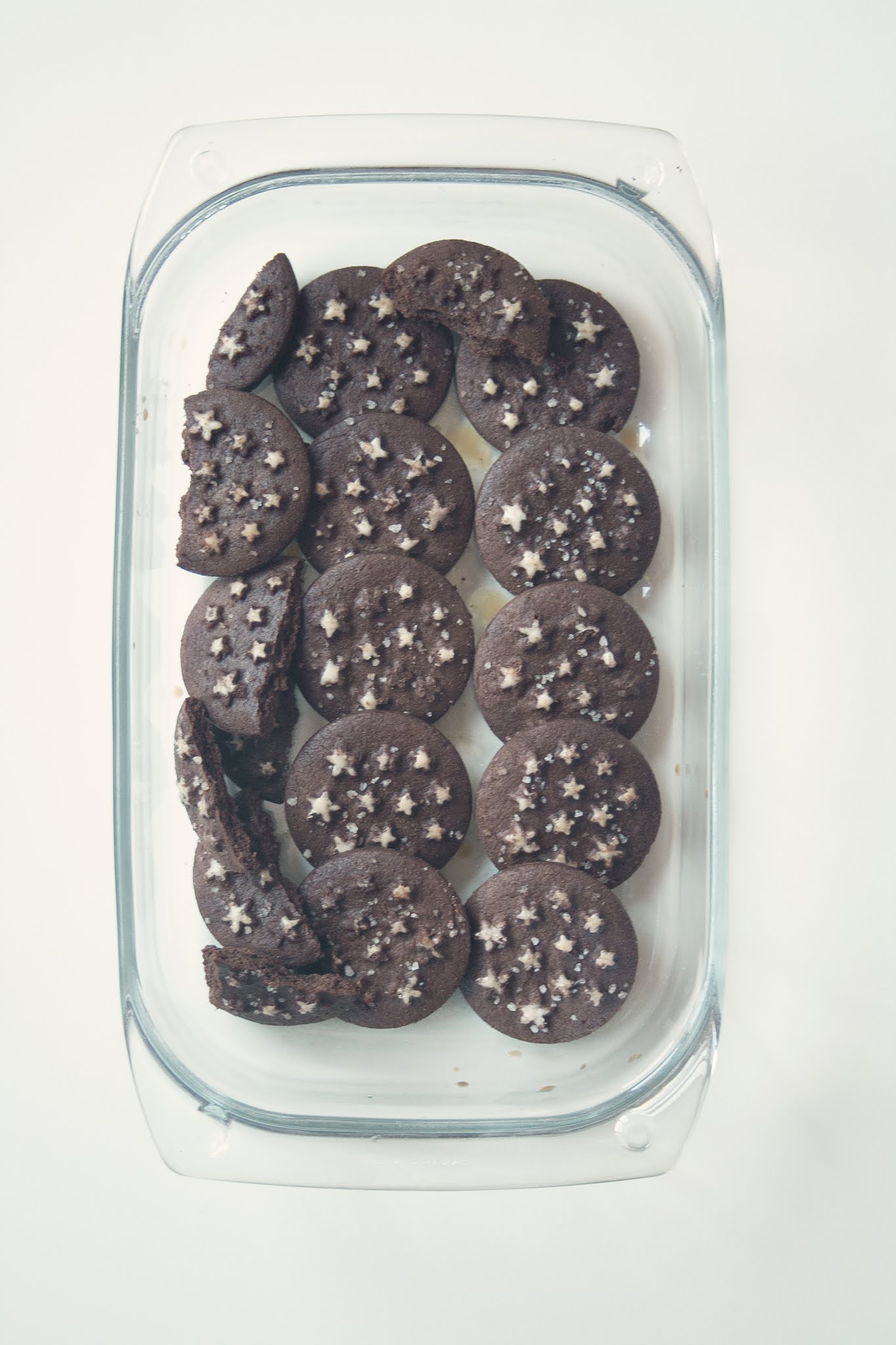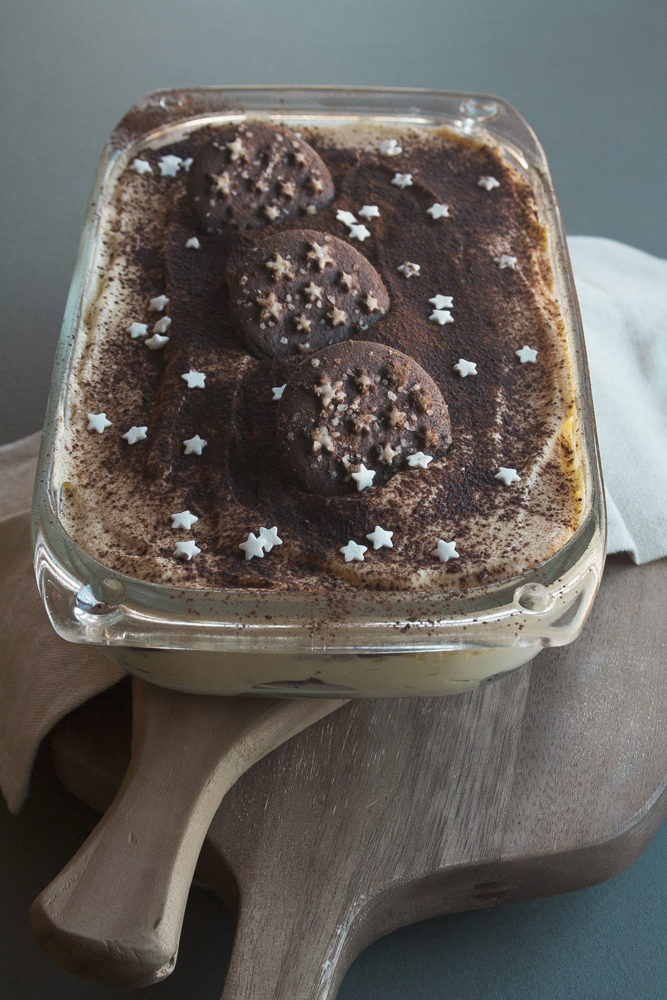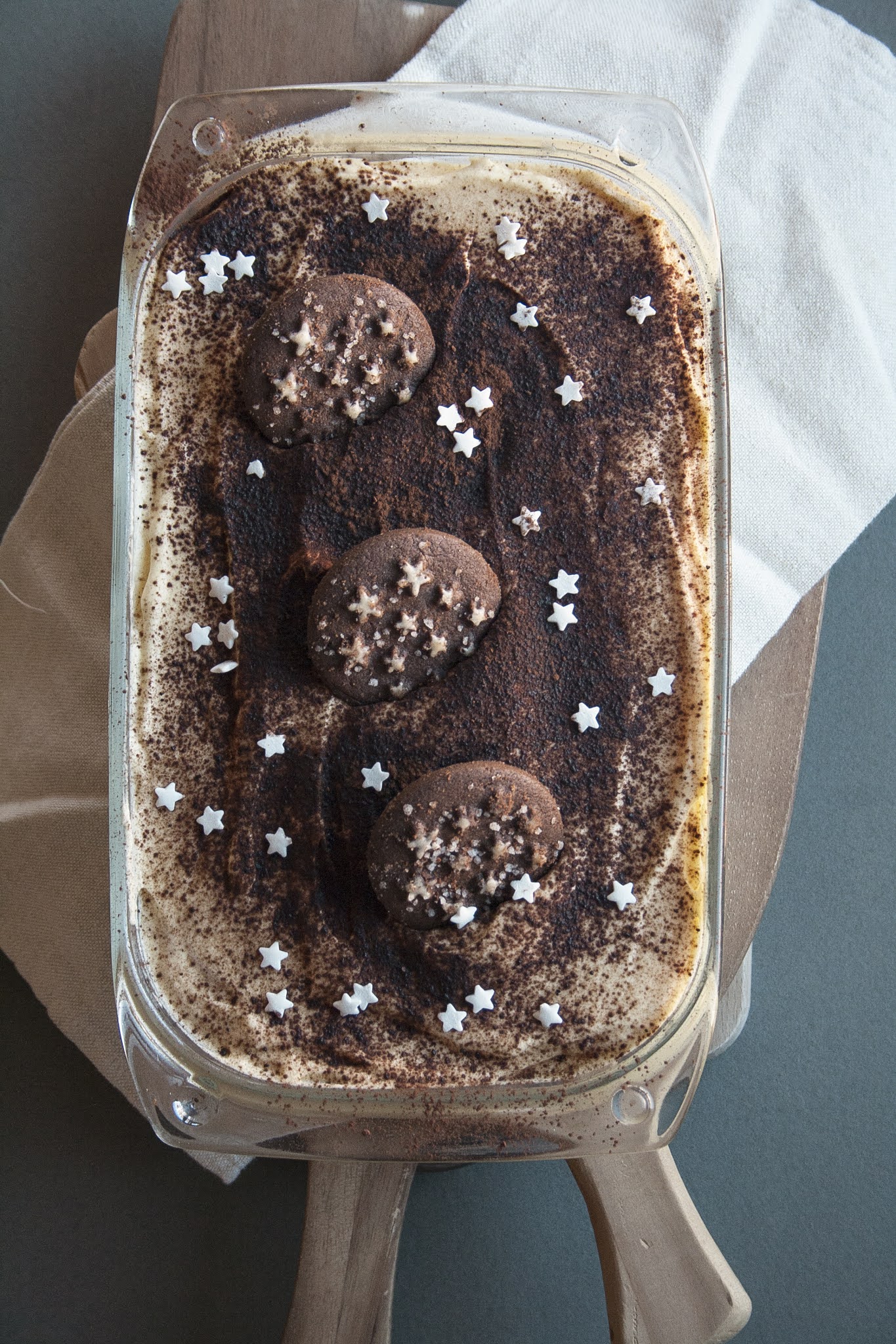 Infine spolverizzate lo strato finale con il cacao amaro in polvere e decorate con le stelline di zucchero.