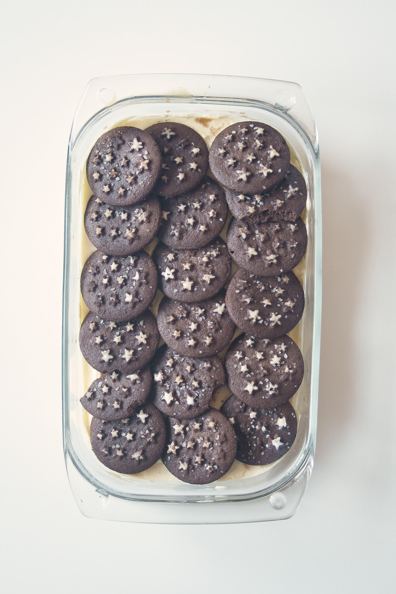 Ricoprite i biscotti Pan di stelle con uno strato di crema al mascarpone e poi procedete a creare un secondo strato di biscotti inzuppati nel caffè.