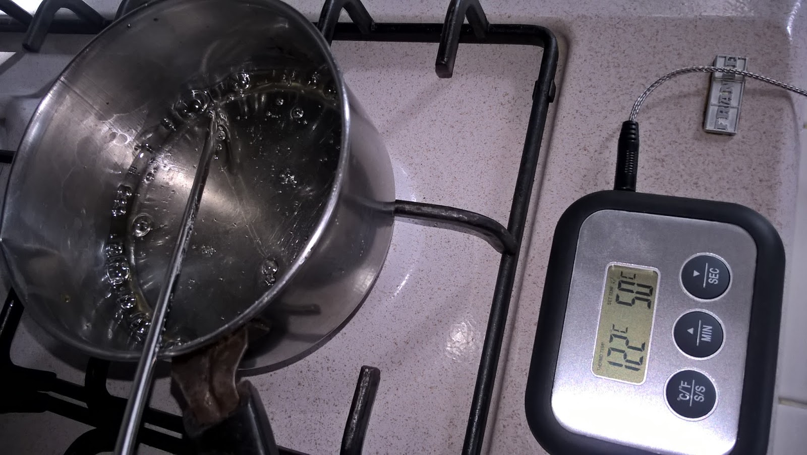 Lo sciroppo deve raggiungere la temperatura di 121°: se avete il termometro bene, altrimenti regolatevi ad occhio; quando comincerete a vedere delle bollicine schizzare, ci siamo.