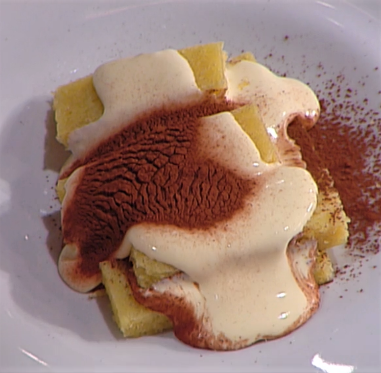 Adagiare i biscotti su un piatto da portata, bagnare con il caffè e nappare con la crema al mascarpone; ripetere l’operazione e spolverare con il cacao amaro.