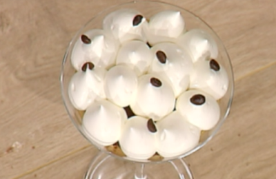 spalmare il cremoso al caffè sul biscotto, ripetere l’operazione e decorare con la crema chantilly sul biscotto e dei chicchi di caffè.