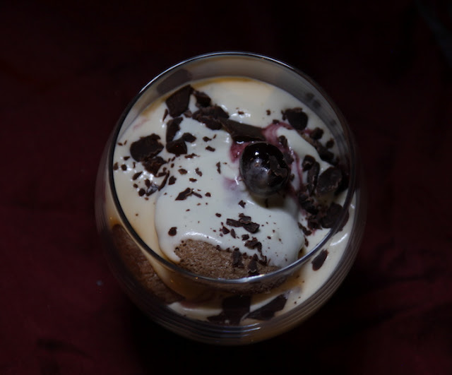 Tiramisù con savoiardi al cacao, bagna al wishky, marasche e cioccolato fondente
