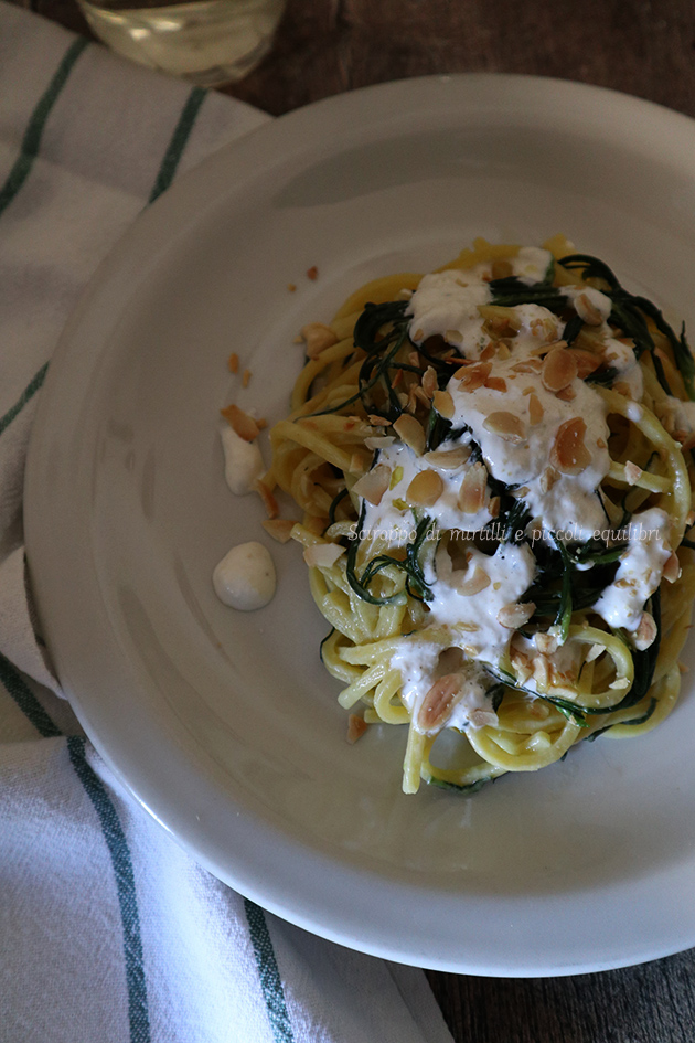 Oggi li propongo insieme alla burrata come condimento per i tonnarelli, un formato di pasta fresco e poroso che aderisce bene il condimento. Infine ho aggiunto la nota croccante delle lamelle di mandorle tostate.