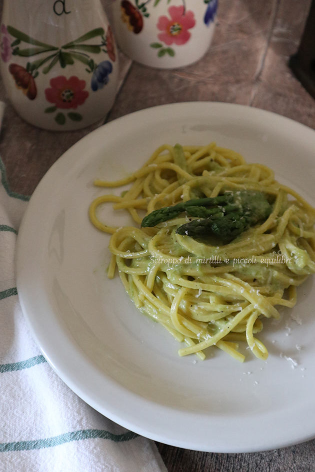 Gli asparagi sono i protagonisti di questo periodo nei mercati e nella mia tavola; li ho utilizzati come purea unendo il gorgonzola dolce per condire i tonnarelli, un formato di pasta fresco che amo molto, perché è poroso ed aderisce bene il condimento. Il sapore della gorgonzola ben si è unito agli asparagi.