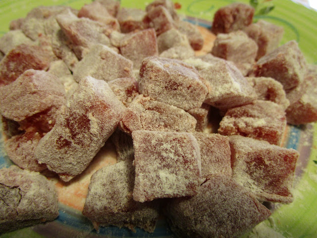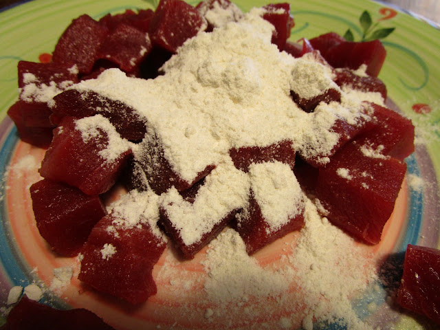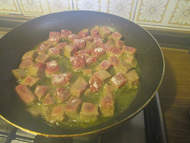 - nel frattempo infarinare i cubetti di tonno e friggerli brevemente, da tutti i lati, per 3 minuti, mettere da parte