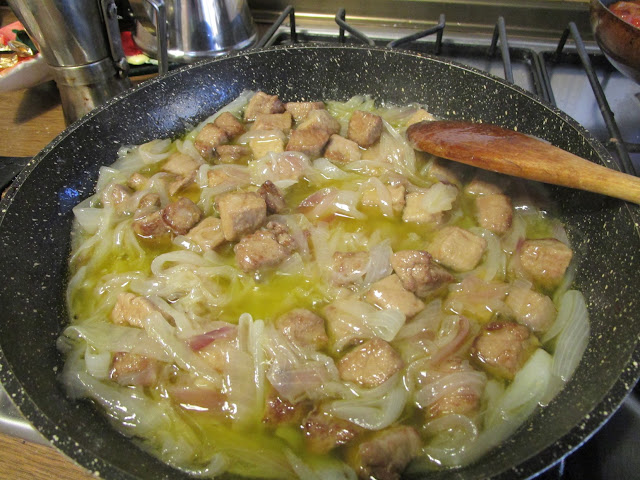 - aggiungere i cubetti di tonno e lasciare cuocere, insieme alla cipollata, per 5 minuti a fuoco basso e mescolando delicatamente