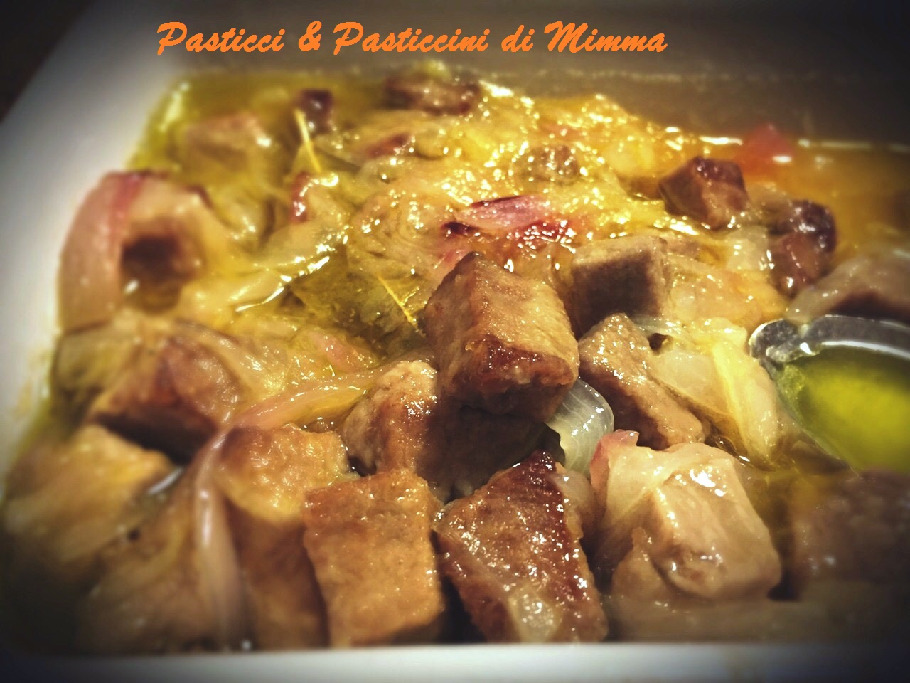 - nella cipolla appassita aggiungere le foglie d’alloro, l’aceto con lo zucchero e mescolare , a fuoco basso per 3 minuti