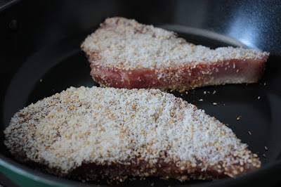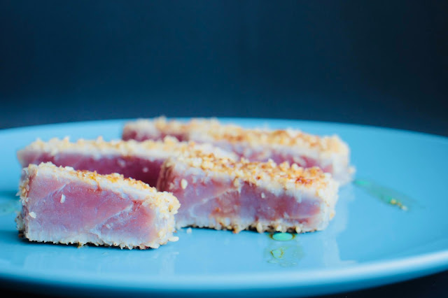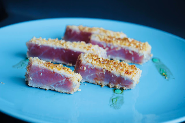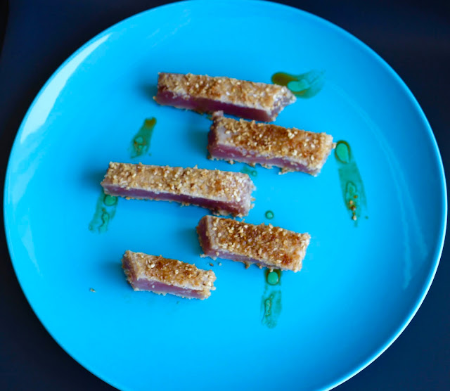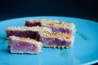 In un altro piatto mescoliamo il cocco con i semi di sesamo e ricopriamo con questo mix il tonno.