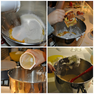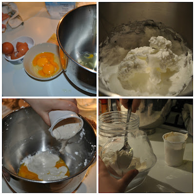 - in una ciotola mettete i tuorli e aggiungete lo yogurt…ora utilizzando il vasetto di yogurt vuoto aggiungete gli altri ingredienti: 2 vasetti di farina, 1 vasetto di fecola, 2 vasetti di zucchero e 1 vasetto di olio di semi di arachide…7 vasetti in tutto appunto!