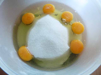 In un’ampia ciotola sbattere le uova con lo zucchero