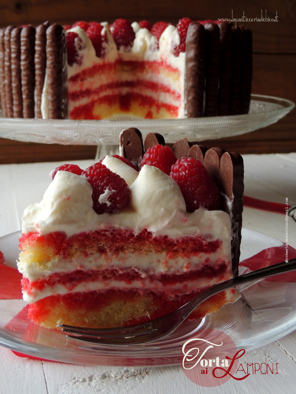 I lamponi, grazie alla loro acidità, vanno ad equilibrare il gusto della torta, che vista la presenza di molti biscotti ricoperti di cioccolato e di una notevole quantità di panna poteva risultare stucchevole.