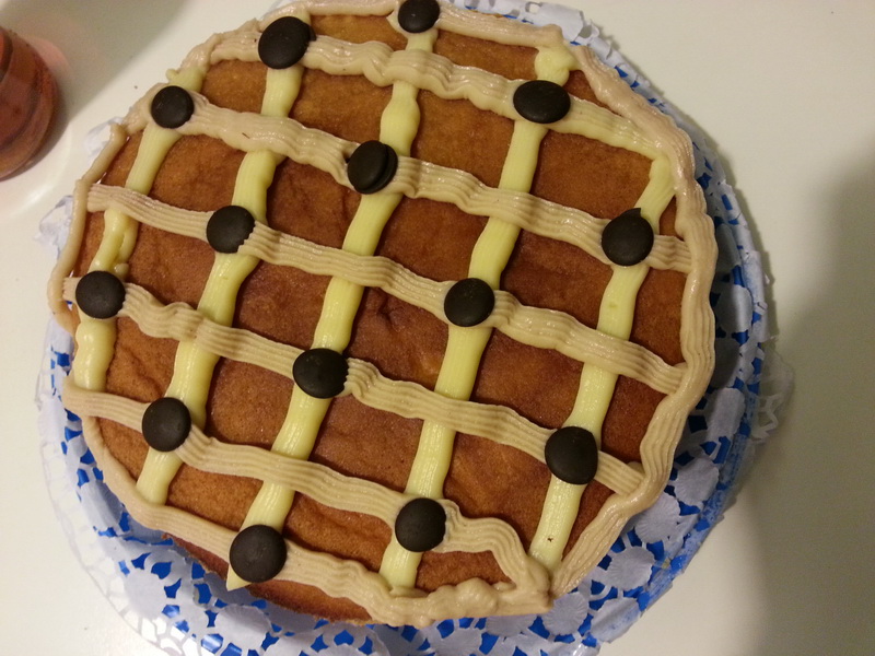 Preparare il pandispagna come spiegato QUI e lasciarlo raffreddare, quindi tagliarlo dividendolo in 3 dischi uguali.