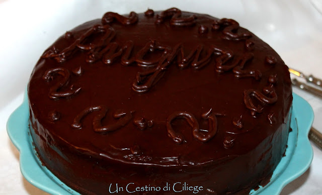 Versate il cioccolato ricoprendo completamente la torta, scrivete, decorate la torta e ponetela in frigorifero minimo due ore prima di servirla.